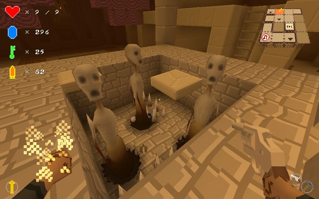 Mummies are not difficult to deal with directly due to their mediocre speed, large figure allowing easy hits, and lack of ranged attacks. However, they can present a significant nuisance due to their tendency to get right back up shortly after dying. The Dagger or Revolver can take out a Mummy in one hit, and Mummies also cannot jump nor climb higher than one block - this is especially helpful when in the presence of a spike pit. If the Explorer finds a two-block high spike pit with crumbling platforms above it, they can lure the Mummy over the pit and drop them in. Being unable to climb, the Mummy will be stuck in the pit, and remain relatively harmless to the Explorer. Be careful, for a Mummy can still try to hit an Explorer that is too close to them, even if they are trapped!